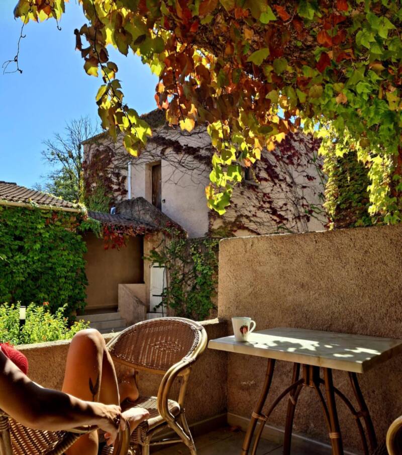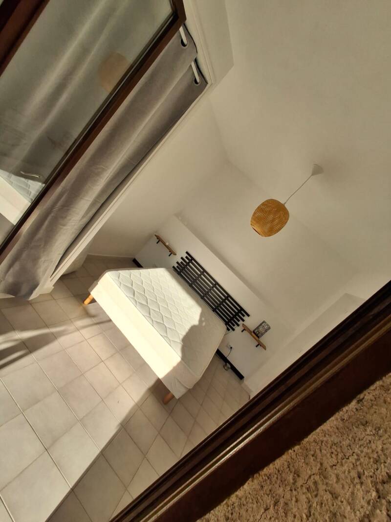 La chambre principale, dotée d’un lit double, s’ouvre directement sur une terrasse privative, parfaite pour les petits-déjeuners au soleil ou les soirées d’été à l’ombre.